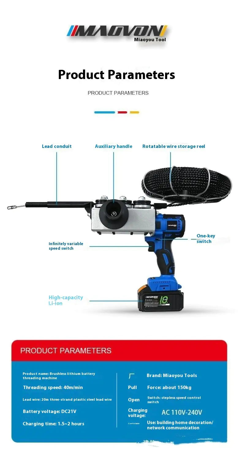 Esta roscadora eléctrica sin escobillas está diseñada para la instalación eficiente de cables internos. Cuenta con un sistema de roscado de 6 ruedas y viene con un cable de plomo de 30 metros, alimentado por una batería de litio. Ideal para electricistas y proyectos de cableado, incluye todos los accesorios esenciales y una bolsa de transporte duradera. Adecuada para equipos eléctricos internos con operación confiable a batería.
